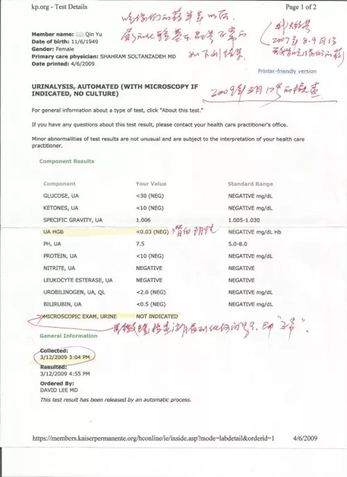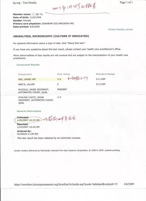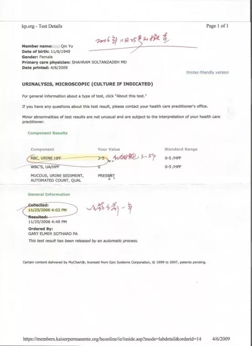 至2006年11月尿中一直有红细胞3-5个、尿潜血阳性,核磁检查左肾功能受损。