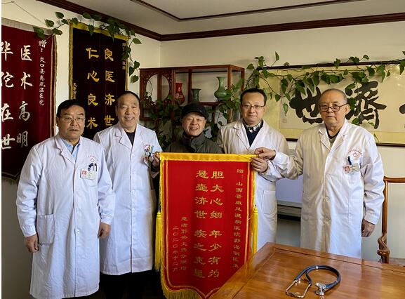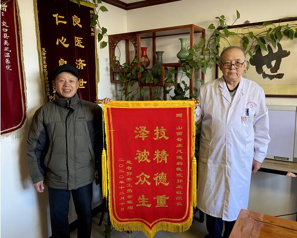 2020年12月14日,正值周一专家诊,郭老先生精神矍铄,行走如常,举止利落,早已不复初诊时憔悴不堪、脚步蹒跚、上楼梯困难的模样,他由家人陪同亲自送来两面锦旗,上书“技精德重,泽被众生”、“胆大心细,年少有为;悬壶济世,疾之克星”分别赠予郭来旺、郭海明两位医师,以示感谢。
